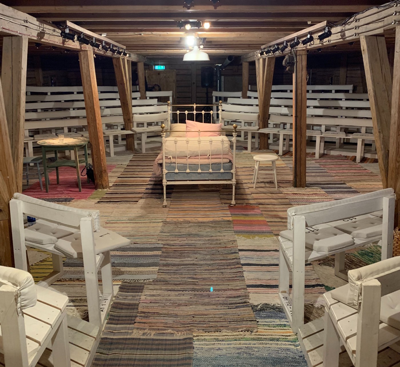 Veckorna här ute på Tofta har bjudit på mycket slit och många skratt. Det är först när vi flyttar in på scenen här som allting kan börja hitta sin plats. Skådespelarna skall vänja sig med rummet som scenografen skapat, till exempel. I år är golvet täckt av trasmattor (tack alla som skänkt mattor!) och risken att snubbla har varit något vi oroat oss för. Det behövde vi inte, det hade scenografen såklart tänkt på. Att en vattenkokare låter så högt att man inte kan leverera repliker samtidigt däremot, det hade vi ingen aning om…